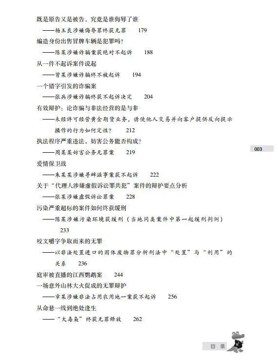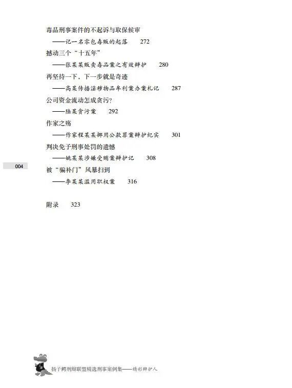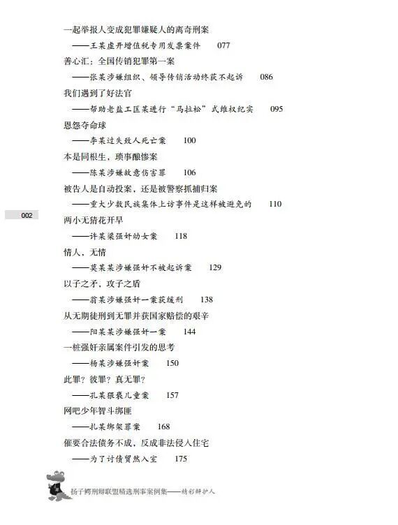 《扬子鳄刑辩联盟精选刑事案例集:精彩辩护人》由周小羊律师主编,扬子鳄刑辩联盟与苏州大学王健法学院合作出版。该书是继《扬子鳄刑辩联盟精选刑事案例集:进攻型辩护》之后的又一本刑辩案例专著。 《扬子鳄刑辩联盟精选刑事案例集:进攻型辩护》于2019年3月由苏州大学出版社出版。 《扬子鳄刑辩联盟精选刑事案例集:精彩辩护人》于2020年7月由苏州大学出版社出版。 《扬子鳄刑辩联盟精选刑事案例集:精彩辩护人》一书包括44个案例,涵盖刑法分则35个罪名,以刑法理论和辩护实践相融合的陈述方式,娓娓道来案件的发生与发展。在律师与当事人的谈话中,当事人不再只是犯罪嫌疑人和被告人的符号化意象,而是推动事件进程的血肉之躯。他们呈现了人性的复杂,有着忿恨、无奈、心酸的思绪,亦有着对生活的希望和期盼。 《扬子鳄刑辩联盟精选刑事案例集:精彩辩护人》的出版希望读者了解到,辩护权是犯罪嫌疑人、被告人的基本权利,律师的辩护不应因此人在道德层面遭到的批判而受到苛责。律师的辩护工作,不仅是为了维护被告人的合法权益,更是为了不抓错一个好人。毕竟,每个人并不是单纯孤立的社会个体,他们的未来关乎着家庭的团圆与幸福。本书亦希望帮助普通读者深入了解律师在刑事辩护中所付出的努力,即使有时这份努力并不尽然折射于案件的处理结果。 律师在辩护全过程中会面对许多意料之外的状况,也许会无力、会无奈,但是终将厘清案件的蜿蜒曲折。在如今的快节奏时代中,我们希望以微弱的个人力量,为全社会的法治进程贡献些许力量。当自己垂垂暮年之际,能够翻阅这样一本书,不歌颂、不宣扬、不说教,单纯记录下自己曾办理过的案件,回顾自己当时的心境。愿所有的刑辩律师,使命在肩,初心不改。 《扬子鳄刑辩联盟精选刑事案例集:精彩辩护人》目录 扬子鳄刑辩联盟精选刑事案例集: 精彩辩护人 定价:68.00元 苏州大学出版社出版 识别二维码,轻松下单购书