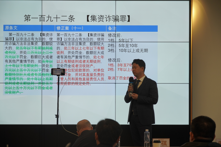 沈亮律师以《刑修十一对非法集资类案件的影响》为题剖析了新法对非法集资类案件带来的变化。他强调,面对修改所带来的影响,作为辩护人应注意,辩护的时间点要把握在提起公诉前,并充分利用好存在自由裁量权的空间,来为当事人争取减轻处罚,引发了大家对于量刑调整和辩护技巧方面的思考。